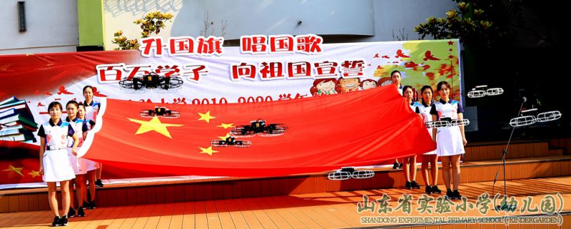 70年艱苦奮斗,偉大祖國日新月異向繁榮;70年創新發展,中華民族奮筆書就新華章!錚錚誓言猶在耳,深情歌聲再唱響。隨著《我和我的祖國》優美旋律的響起,師生手中的一面面國旗迎風飄揚,如一顆顆赤子之心向祖國告白。與此同時,無人機編隊在隊伍的前方徐徐升起,隨著音樂的律動,上下翻飛,變換隊形,給師生們帶來新奇體驗的同時,更以科技的進步昭示著創新的力量。