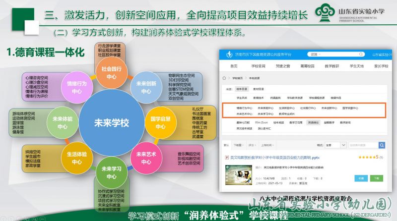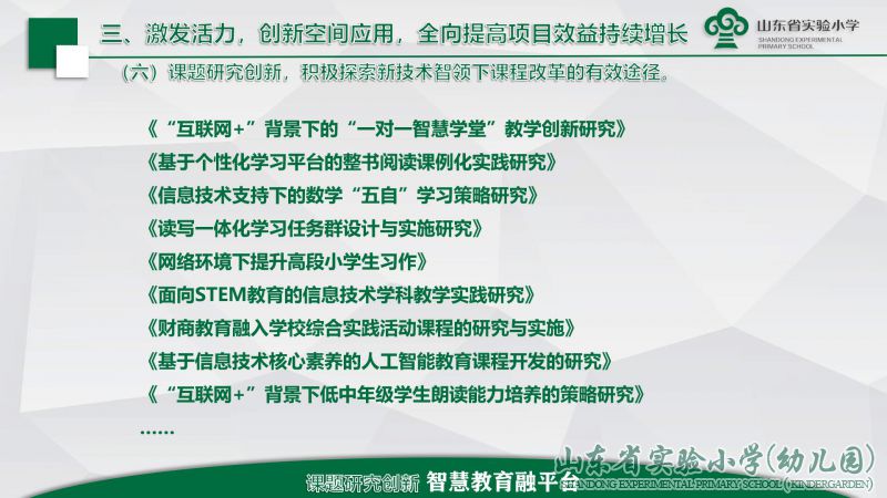 加快實施德育課程一體化,創建“八大學習中心”,形成“潤養體驗式”五色德育課程體系;充分利用“一對一智慧學堂”,探索基于“電子書包”環境下的學生核心素養發展途徑;遍布各處的數字閱讀終端與空間閱讀相結合;引進“山東省人工智能教育教學與監測平臺”,利用創客空間開展人工智能教育課程開發和面向STEM教育的信息技術學科實踐研究。