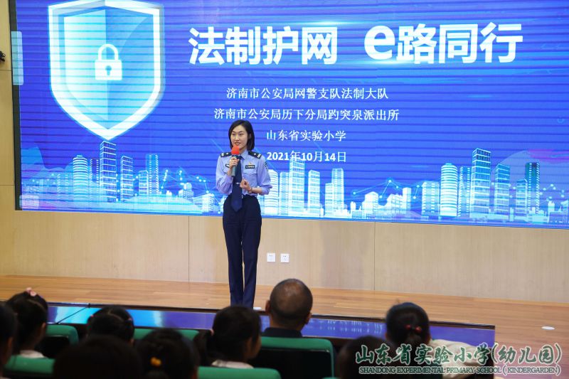 10月14日,濟南市公安局網警支隊法制大隊支部書記、大隊長任曉蕾、民警艾鵬走進山東省實驗小學,在“國家網絡安全宣傳周”的法治日里,為全校師生帶來了一場以《法制護網e路同行——網絡安全宣傳進校園》為主題的精彩講座。濟南市公安局歷下分局趵突泉派出所副所長董圓,我校校長、黨總支書記苗建,副校長、黨總支委員李篤強、鄭國棟參加活動。