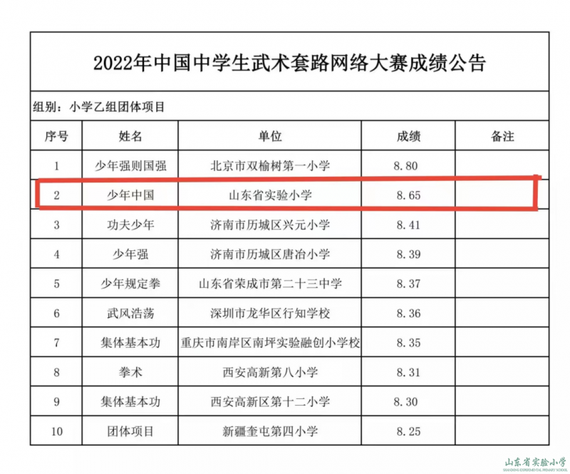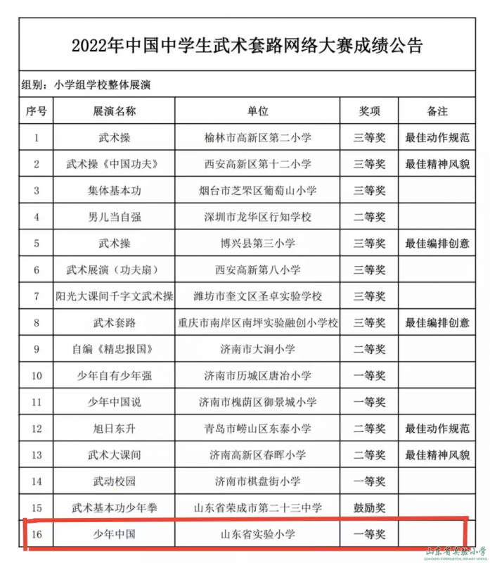 2022年5月,我校武術隊積極參加由中國中學生體育協會主辦的中國中學生武術套路網絡大賽,共有來自全國20個省144所學校的1196名運動員報名參賽。經過激烈角逐,我校武術團隊在本次大賽中喜獲小學組學校整體展演一等獎,小學乙組團體項目一等獎,教師和多名學生分獲優異成績。