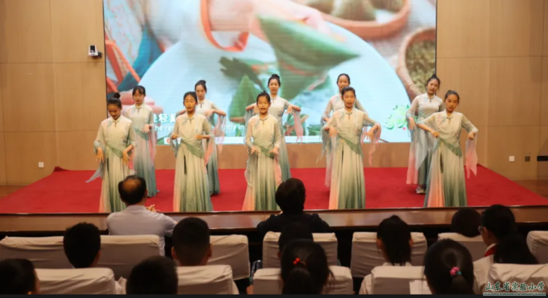 緊接著,隊(duì)員們帶來《南北謠》歌舞表演。輕盈的舞姿與悠揚(yáng)的歌聲交織,既展現(xiàn)了南方水鄉(xiāng)龍舟競渡的熱鬧場景,又呈現(xiàn)了北方端午掛艾祈福的民俗風(fēng)情,生動詮釋了 “多民族融合為一家” 的文化內(nèi)涵,將對古圣先賢的追思化作對中華文化的禮贊。兩位主持人發(fā)出擲地有聲的倡議:“作為新時代少先隊(duì)員,我們要承繼這份家國擔(dān)當(dāng),化千年追思為報國之志!” 全體隊(duì)員合誦 “感恩求索,刻苦鉆研,報效祖國!”,進(jìn)一步點(diǎn)燃了愛國熱情。